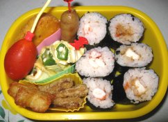 曇ってて、今はほどよい気温。夜はやっとエアコンを切って寝てみましたが、それでも寒くて目が覚めてしまい、途中で毛布をひっぱり出しました。ちいちゃんが暑いって言うかもと思って扇風機は消さずに。それでもちいちゃんは「暑かった」だって。じゃあ子ども部屋に布団戻したほうが良さそうね。・おにぎりorご飯・冷しゃぶ・ウィンナ・たこ焼き・かぼちゃ天・オクラちくわ巻き・ミニトマト・ごま団子今日はなぜか気合の入ったお弁当?エフクラブで来月お弁当のおかずってことになったので、いろいろ考えてたらつい 豚しゃぶ用肉を解凍したときはいつもどおりオクラ巻きにしようかと思ったんですが、いつも同じだとつまらないので(私が)、肉は久々に冷しゃぶにして、オクラはちくわで巻くことにしました。冷しゃぶは白ネギと酒を入れたお湯で茹でて、氷水で冷やし、ゴマドレッシングで和えるだけ。ゆで汁は夕飯のときにスープに使うつもりで取ってます。オクラは茹でてからめんつゆに漬けて。ちくわは縦3本に切って、内側に細かい切れ目を入れてからさっと焼いて、うなぎのタレで絡めて蒲焼風に。冷めてからオクラ、薄焼き卵、ちくわの順に巻きました。今日は久々にごま団子を。生協に買い物に行ったとき、乾燥のあんを買っておいたので。これだと思いついたときに少量のあんを使えるから便利です。ひかちゃんはまたお友達にあげるかもしれないなと2個入れておきました。でも帰ってから「もっと作ってないの?」って絶対聞かれると思う・・・実はだんご粉が少ししかなかったから作ってないんだけど、買ってきておかないとね。かぼちゃはいつも買ってきたときに一部をスライスして冷凍してあります。そしたら天ぷら粉つけて揚げるだけで使えるので。今日は幼稚園から頼まれてる、オルガンカバーを作る予定です。