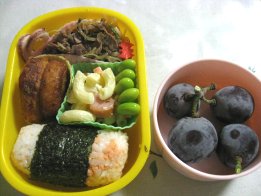 ずいぶん涼しくなった日でした。私は七分袖の服を出して着ました。・おにぎりorご飯・ギョーザ・かにかま入り卵焼き・じゃがいも豚肉巻き・ほうれん草ベーコンバター炒め・リボンパスタのトマトクリーム和え・豆腐ステーキ明太ソース今日は幼稚園のお手伝いだったので、自分のぶんも詰めました。ついでに朝ごまベーグル焼いたので、役員と副園長先生のぶん合わせて5つ、ベーコン、レタス、卵などを挟んでサンドイッチにして持っていきました。茹でじゃがいもがあったので、しゃぶしゃぶ肉を巻いて焼肉のタレをからめました。ギョーザは先日60個作ったら足りないしと90個作ってみたら余ったので冷凍してあったもの。こうやってお弁当に1個2個入ってるのもいいものですね。豆腐ステーキは水切りした豆腐に片栗粉を付けて焼いてます。明太ソースは、明太子、マヨネーズ、牛乳、レモン汁、小ねぎを混ぜて作ります。マヨネーズと合わせると明太子って全然辛くないので子どもでもOK。自分で自分のお弁当食べてみて、なかなか味にバラエティがあって美味しかったです。へへ、自画自賛。^^;でも甘みがなかったな~。かぼちゃかさつまいもを入れたほうがいいわね。園児のお弁当を少し頂いたんだけど、さつまいもとレーズンの甘煮があって美味しかったです。今日は一日幼稚園でした。朝は幹事会で夏祭りの報告や運動会の打ち合わせなど。そのあと注文してあった園児へのおみやげ品を詰め合わせる作業。なんか手違いでフレーベル社のだけ届いてなかったので、お昼食べてからおしゃべりして時間をつぶしました。卒園児や来園児へのおみやげ(ブルボン”プチシリーズ”)や、父母競技に出る保護者へのラップやホイルを数えてダンボールに詰め替えたり、いろいろ忙しく。あ、あと仮縫いして持っていったオルガンカバーを合わせてみたりとか。だいたいちょうどよかったので、明日ミシンで縫ってしまおう。でもようやく1つ作ったとしても9クラスあるから、また色違いの布を買ってきてぼちぼち作っていかないとね。急がないってことだし。^^;家に着いたら4時半くらいでした。買い物に行くつもりだったけど、疲れてたので明日にすることに。今朝義母からマスカットが届きました。夏は桃を、秋は巨峰、マスカットを毎年贈ってくださいます。何よりも子どもたちが喜ぶプレゼントでありがたいです。今年のマスカットは2房変わったものが入ってました。『ロケットぶどう』だそうです。細長い形が面白い。マスカットほどの香りはないですが、独特な味わいがあって美味しかったです。