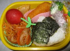 台風が近づいているとかで朝は小雨がぱらり。だいたい一日曇ってました。みいちゃんは川遊びの予定がやっぱり延期になり、金曜になったそうです。・焼きうどん・玄米おにぎり(パパ、ひか)・コーンフライ・大学芋・ぶどう(パパ、みい、きら)・ナゲット(パパ、みい、きら)・えびグラタン(パパ)・卵焼き(パパ)下二人の焼きうどんは薄焼き卵でくるんでオムそば風にしました。ひかちゃんの焼きうどんには青海苔はかけず。前回「歯につくからやめて~」って言われたので。^^;ぶどうはダンナの実家から届いたピオーネ。今日はそのまま入れたからぬるかったかも。明日は冷たいのが食べられるようにと一部冷凍してます。今日ちいちゃんが上靴を忘れて行ったので持っていくついでに、夏休み作品展を見てきました。1年生の女の子の作った絵本・・・カタカナの”レ”が反対向いてたり、まだ字の間違いがいっぱいなんだけど、ちゃんと絵も入っててかわいい作品だったなぁ~。工作や模型、家庭科の作品、自由研究など様々で面白く、いつも時間かけてゆっくり見物してます。6年生ともなると恥ずかしいものは出せない、という感じになるのか力作ぞろいでしたね。宮崎に行って口蹄疫のことを調べてたのがあって、水泡の写真とかリアルですごかった~。妹の入園グッズ(絵本バッグ、靴袋等)を全部作った女の子の作品。とても上手に出来てました。このお母さん、うまくお姉ちゃんを使ってるわねぇ~。^m^今回はソーラークッカー、実物も出品するので理科展の模型部門に出してもらえるそうです。普段使う、小さめのフライパンも入ってるんですけど・・・。出品終わって返ってくるまで使えないわね。^^;