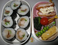 雨です。昼からやむという予報ですが、どうかなぁ。・トンカツ巻き寿司・焼肉巻き寿司・えびカツ・鮭の白醤油漬け焼き・卵焼き・ミニトマト・枝豆・ほうれん草バター炒め1枚しかない冷凍トンカツもこうやって使えば、ね昨日きらちゃんをお医者さんに連れて行ったら、お腹の風邪と診断されました。下痢は2日に1回なんだけどね。熱は朝は下がるんだけど昼から上がるというパターンが土日月と続いたので、今日も念のためお休みです。今日一日出なければいいんだけど。私もうつったようで、熱はないんだけどなんか昨日からだるさとムカムカ感が。昨日はお昼にパパが帰ってくるまで寝てて、お昼はレトルトカレーに。昼からも下二人勝手に遊ばせておいて、3:30に診察予約してたので3時ごろまで寝てました。今朝はほとんど大丈夫。朝は焼きドーナツをホットケーキミックスで作りました。先週餡ドーナツを作ったのと同じ生地(ミックス200g、卵1個、ヨーグルト少々)をドーナツ型で抜いて180度オーブンで15分焼いただけ。油で揚げなければきらちゃんも食べられるかと。パパや上3人は生クリームつけて食べました。