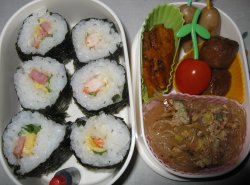 雨が降る予報ですが、まだ降ってません。・細巻き寿司2種・マーボー春雨・ウィンナ・ミートボール・ミニトマト・かぼちゃのガーリックソテー・ミニハンバーグ(パパ)あ、またひかちゃんのお箸入れ忘れたのに気がついた・・・。まだ割り箸持っていったの、残ってるかな?^^;肉気の足りないのをお寿司にすることでごまかしました。ハムが2セットも届いたからハムだけはいっぱいあるんですけどね。細巻きは海老メインのとハム(といってもミートローフって書いてあった)メインのと。もちろん下二人のだけ、海老にはアボカドを。昨日ギョーザをしたら具が少し余ったので、それを使ってマーボー春雨にしました。残った具をそのまま炒めて、茹でた春雨を入れ、中華料理の素と赤味噌と水を入れて少し煮込み、ゴマ油少し。水とき片栗粉でまとめて完成。なかなかいい再生法だなと今朝、ヤフーで落札した手作りの木製ミニキッチンが届きました。下二人へのクリスマスプレゼントです。冷蔵庫とレンジも付いてて、すっごくかわいい。以前姉にお下がりでもらったプラスチックのキッチンが割れてボロボロなので、今更かなと思いつつ。でもこれなら孫の代まで使うわ、きっと。見つからないように押入れにしまっちゃったので、写真はまたクリスマスのときに。ちいちゃんは服(ピンク系長袖ワンピだって)が希望だそうで、これから探さないと。今日は今から明日のエフクラブの買い物です。