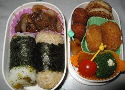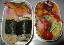 雨です。今日雨なら昨日もっと洗濯しておくんだったぁ~と後悔先にたたず。^^;・おにぎりorご飯・エビフライ・ミニポテト・梅酢たこ・えのきベーコン・にんじんのソース炒め・しらす入り卵焼き・ミニトマト昨日買い物に行かないつもりだったのに、シュトーレン焼こうとしたらバターが足りなくて。仕方なく買い物に行ったので、ついでにお弁当用に安いエビを買いました。お弁当にエビがあると見た目も豪華になるし子どもたちが何より喜ぶみたい。梅酢たこはいつもの通りきゅうりと漬けてあるんですが、きゅうり嫌いなひかちゃんはきゅうりなしで。ひかちゃん、3学期から生徒会(会計)に入ることになりました。去年せっかくやる気になってたのに落選したからどうしてもやりたかったみたいで。今度は対立候補がなくて無投票当選。勉強に部活にと充分忙しいからどうかと思ったんですが、まぁ最近は友達と映画に行く余裕もあることだし。いい経験になればと思います。昨夜『ヤッターマン』を家族で見ました。私的には面白かったけど、ひかちゃんは途中で面白くないからと自分の部屋へ退散。疲れがたまってたみたいで早めに寝てました。みいちゃん、きらちゃんには結構ウケてました。「おしおきだべ~」とか「ぽちっとな」とか覚えて、見終わったあとパパときゃあきゃあふざけあってました。今日はちいちゃんの個人懇談です。晴れてたら自転車で行けたのになぁ。