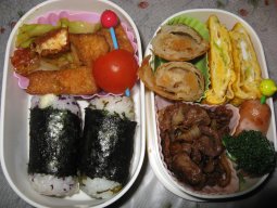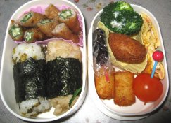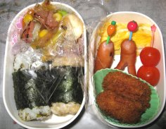 時々晴れ間もありましたが、寒い日でした。・おにぎりorご飯・トマト鍋残り・鶏のマヨネーズ焼き・マカロニサラダ・サラダエビ・一口揚げ・青海苔入り卵焼き昨日はこの冬二回目のトマト鍋をしたので、その残りにチーズ乗せて焼いただけ。鶏のマヨ焼きも冷凍品を焼いただけだし、ちょっと手抜き弁当でも代わりに朝からミニカレーパンを作りました。うっかりして水を入れ忘れてHBを動かしてしまってたので、生地が出来たと思って開けたときにはポロポロした粉状・・・バターと卵の水分だけじゃあねぇ。水を入れなおしてもう一度生地を作り直してたら時間が足りなくて、半分だけ作ってあとは残しておいて出かけるはめになりました。今日は朝から幼稚園へ。仮決算をして、卒修記念品にいくら使えるか割り出してから、カタログを色々見て年長、年中、年少それぞれに合ったもの(文具、おもちゃ、教材など)をあれこれ決めました。今年は夏祭りや運動会がお天気もよくて利益があがったため園児1人に3000円くらいの予算があり、かなりいろんなものを選ぶことが出来ました。買い物は楽しいし、自分の子どもがもらってくるものなので欲しいものを入れることが出来るから役得な仕事。大体選んだところで副園長先生がフレーベル社、チャイルド社などの担当さんに電話して値引き交渉してくださって正確な値段が決まり、ちょうどいい感じに納まりました。子どもたち、木曜日は体操教室の日だったので朝行ったらすぐ体操服に着替えてました。年中、年少、年長の順に園庭に出てきては様々なことをやってました。時々上から、へぇ~こんなことやってるのねと様子を覗いてました。みいちゃん(年中)は大縄飛び。なかなか回っている縄に入れないでいる姿に笑えました。5回くらい見てからですが、ちゃんと入って飛んで出ることが出来てました。きらちゃん(年少)は小さなハードルをちょこちょこと飛んでました。それにしても、今日みたいな寒い日に体操服にスモックを着ただけで外に出られる子どもたちってすごいです。私は帰りがけ暖房した部屋から外に出たら、コート着てても寒くて歯の根が合わないくらいでした。お昼のお弁当を頂いてからはひな祭りの話し合い。毎年、園児にはPTA会費から特別に用意したお弁当とお菓子を配り、幹事さんたちにもお弁当とお菓子を用意するので、どこのお弁当にするか決めたり、お菓子の買出しの日程決めたり、店に電話して交渉したり。途中でいろいろ雑談もしてたので、終わったのは3時すぎ。バス乗せないで待たせてた下二人を連れて帰りました。明日は昼から小学校。まずもちつき大会の打ち合わせがあり、そのあと授業参観です。パパが仕事を抜けられないそうなので、参観あとの講演会はパスして帰る予定です。