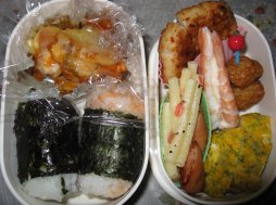 寒い日が続きます。今日も晴れたり曇ったり。・おにぎり・味噌漬け豚の蒸し焼き・ウィンナ・スパサラダ・ブロッコリ・ミニトマト・コーンクリームフライ・卵焼き豚の味噌漬けを買ったら「野菜を敷いて蒸し焼きにも出来ます」と書いてあったのでいいなと思って。キャベツと白ネギを敷きました。サラダスパゲティとミニホタテをドレッシングで和えてサラダに。インフルエンザが流行ってます。お隣の奥さんは治ったところ、お向かいのあーちゃんは昨日から。小学校でもかなりお休みの子がいて、もちつき大会が中止になってしまいました。前日、当日とお手伝いに行くことになってたので楽にはなりますが、子どもたちが楽しみにしてただろうに残念です。ウチはまだ誰もかかってませんが、きらちゃんがここ数日咳&鼻なので時間の問題かも。今日はお昼、ピザを焼いて友達二人呼んでランチしてました。いろいろおしゃべりして気分転換になりました。明日はエフクラブ。今回はウチでなくJさんのお宅を借りることになりました。韓国の方なので、本場的なキムチ鍋が食べられるのが楽しみです。
