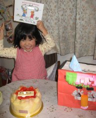 きらちゃん4歳になりました。だいたい子どもたち2~4歳くらいはキャラクターケーキを作ってあげてたんだけど、今回はそうもいかず初めてケーキ屋さんのケーキでお祝いすることになりました。幼稚園で作ってきた”おにのお面”も一緒に。大事にずっと持ってるのは今日幼稚園でもらってきた、たんじょうび絵本。年少さんだけもらえるんだけど、今年はぐりとぐらのだったのね。みいちゃんのときは違ったような。この絵本に自分の手形や足型を付けたり、写真が貼ってあったりするのですごく気に入ったみたいで、ケーキと写真撮ろうとすると自分から持ってきました。きらちゃん、「いい顔して!」って言うと必ず顔をくしゃくしゃにするからしかめっつらに見えてしまいます。いちおう4歳の”4”を出しているつもりですプレゼントはマイクロペットを。【タカラトミー】小さいのにとってもかしこいプチペット!【訳あり】マイクロペット-i RISU アップルパイマイクロペットは上二人が古いのを持ってたんですが、これはマイクロペット-i。赤外線センサーで障害物を避けたり出来るとか進化してたので。ちなみにみいちゃんにも違うのを買いました。2体で会わせると合唱するとかいう機能もあるので。安かったのでアンパンマンのトランプも。【セイカ 】それいけ!アンパンマン トランプあと写してませんが、上二人のお姉ちゃんたちからいっぱいお菓子をもらいました。切り紙の大好きなきらちゃん、さっきくもんの『やさしいきりえ』【送料無料】やさしいきりえ新装版っていうのをしてたんですが、私がお風呂に入っているうちに最後のページの固い紙(本当は親が切るページ)を自分でやりかけて、少し自分の指を怪我してしまいました。たいしたことなかったんだけど、「もうはさみやめる~!」と号泣してました。明日になったら忘れてるかな?^^;まぁちょうど『やさしいきりえ』が全部終わったとこなので、しばらくいいかな私、今日は熱下がったのに咳がひどくなって腹筋が痛くなってきました。咳が出てるうちは下二人のお風呂はちいちゃんにお願いする予定。早く回復したいものです。