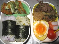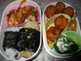 ちょっと曇ってます。70%ということなので部屋干しにしました。・おにぎりorご飯・ネギチリ・ミニポテト・ピーマンの天ぷら・つくね団子・ウィンナ・ブロッコリ・チーズ&ミニトマト(みい、きら)昨日の『お試しかっ!』でタカさんが野菜ばっかり5日間食べるっていうのをやっていて、その中のメニューから2つ参考にしました。まず1つ、ネギチリはエビチリのネギ版。シーフードミックスが少しあったので、ウチではそれも使いました。片栗粉つけて油で揚げて。チリソースはウチでは辛いとだめなのでケチャップ、砂糖、醤油、酒で。もう1つはピーマンの天ぷら。半分に切ったピーマンをトースターで皮が焦げるまで焼いて皮をむいてから、青海苔入りの天ぷら粉付けて揚げます。よく焼くことでピーマンの甘みを引き出し、青海苔の風味でピーマンの味を消すそうです。他にも美味しそうなものがあったので試してみたいと思います。昨日咳止めの薬をいっぱいもらってきました。おかげで12時から朝5時まで起きずに寝られました。今日も咳は激減。ほっとします。副作用で眠いからゆっくりしたいと思います。