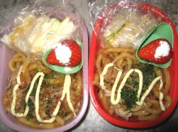 いい天気です。・焼きうどん・サンドイッチ・いちごひかちゃんの学校は高校入試のため授業がなく、今日から3日まで自宅学習となります。体がきついときに早起きせずに済んで助かるわ。ってことで今日のお弁当は下二人のもの。昨日ご飯をしかけられずに寝たので冷凍のうどんを使って焼きうどんにしてみました。ふんわり食パンがあったからサンドイッチも。ハム、チーズ、薄焼き卵、レタスを挟んでます。いちごにかけてるのはミルクパウダーっていう粉状の練乳みたいなの。昨日夕方にお医者さんに行ってきました。やっぱりA型が出ました。どこでもらったんだろうか?やっぱ買い物とか?寒気が半端じゃないからたぶんそうだと思ったけど。ってことで夜にタミフル飲んで寝たら、朝には7度に下がってかなり体もラクです。すごいなぁタミフルの威力。2年前だっけ、B型にかかったとき自力で治すはめになって元気になるまで2週間くらいかかったし2kgやせたし、あれは大変だった・・・。さて、もちろんマスクしたまま寝てますが、きらちゃんにうつらないといいなぁ。