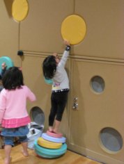 市の主催する『親子で遊ぼうパパ・ママ・キッズ』というイベントに参加してきました。部屋の壁に丸いクッションがはめ込んであって、外して遊べるもんだから相当楽しんでました。最初の”親子で運動体験”の講師はバルセロナ五輪のメダリストの相原さんが教えてくださって感激。簡単な柔軟からいつの間にか子どものバック転につながる動きになってて、教え方の上手さが印象的でした。2人を相手するのが大変なのでお手伝いに入ってくれたお姉さんと。途中休憩からは子どもたちだけで運動あそび、親は食育講座ということで調理実習。ひなまつりメニューということで簡単にできる押し寿司、とろろすまし汁、フルーツカスタードを教えていただきました。作り終わると子どもたちも呼んで一緒に食べました。美味しかったので是非ひなまつりにやりたいと思います。このカスタードの簡単なこと、目からうろこでした!なんと、卵にみかん缶の汁とコーンスターチを混ぜるだけ。これなら子どもでも作れるので急いでるときとか使えそうです。終わって帰ろうとしたんですが、隣に『元気のもり』って楽しそうなところ(小さい頃何度か来てたんですが)があって・・・ふたりとも「ここで遊ぶ!」やっぱりつかまってしまいました。イベントが10時から1時半くらい。『元気のもり』で4時半まで。めちゃくちゃ疲れました。でも楽しそうに次々と遊んでました。