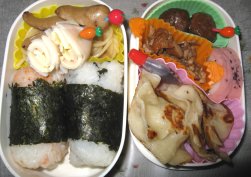 曇ってますが昼から晴れる予報です。・おにぎりorご飯・ごぼう牛肉巻き・トマトクリームパスタ・ミニトマト・キンピラこんにゃく・ウィンナ・コーンフライごぼうを少し酢を入れた湯で下茹でし、塩コショウをふった薄切り牛肉で巻いて焼き、しょうゆとみりん、1:1の割合で味付け。ごぼうは噛み応えがあって肉少しでも満足感があるもんね。今日もこんにゃくをキンピラで。・・・パパとみいちゃんは逆に太らせないといけないんだけどなぁ。^^;今朝は珍しくパパが朝から仕事があると8時過ぎに出かけて行きました。おかげで早い時間から1人になれてうれしい~洗濯物干したらゆっくりしよ明日は幼稚園から動員がかかって、市の団体が主催する子ども連れイベントに行く予定。パパに送ってもらって下二人と参加します。始めに一緒に運動して、その後子どもだけ別に運動してる間、親は料理教室みたいなのがあってお昼を作り、一緒に食べてから帰るそうです。