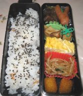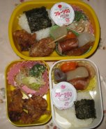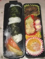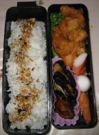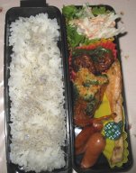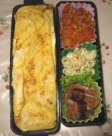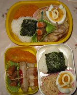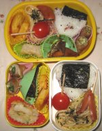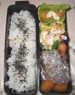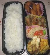 暑い日でした。パパの新しいお弁当箱です。前とほとんど大きさ同じくらい。・おにぎりorご飯・エビフライ・ナゲット・オクラ豚肉巻き・サーモン入りスパゲティサラダ・肉味噌入りオムレツ肉味噌は昨夜レタスに巻いて食べたものの残り。エビフライは冷凍品。^^;下二人は山登り遠足だったので、早く食べ終わって遊べるように・エビフライ入りおにぎり・オクラ豚肉巻き(ピック刺し)・サーモン入りスパゲティサラダ・ミニゼリーと少なめにしました。二人とも早く食べ終わって充分遊べたそうです。私は水曜なのでいつものバドミントン。でも上ばっかり見上げてたせいか、側筋のときに首筋張りすぎたせいか、首の後ろから頭が痛くなって、夕方から湿布はったり、薬飲んだり。「頭イタイ~」って言いながらも生協の注文(ネットで)をしなくちゃとかいろいろあって、やってたら、ひかちゃんが黙って洗い物をしてくれました。こういうときはさすが長女ですね。ありがたかったです。