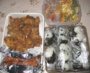 とりあえず、お弁当を。・おにぎり・唐揚げ・ウィンナ・えのきベーコン・マカロニサラダとすごーくオーソドックスなお弁当。でも副会長として運動会を仕切るほうに頭いっぱいで、凝ったものを作る余裕がなかったのよね。^^;ミニトマトとか買っておくのさえ忘れてたし。まぁ唐揚げさえあればOK、って感じです。