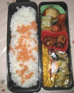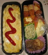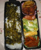 朝小雨だったので下二人は長靴を履いて行きましたが、午後から晴れてきました。・ご飯orおにぎり・かぼちゃ天・唐揚げ・ウィンナ・ツナレタス・卵焼き・にんじんのソース炒め上二人のご飯には高菜を乗せました。唐揚げは冷凍の一口大鶏肉を夜に解凍しておいたので、朝に味付けして。あまり(生協のカタログで)冷凍の鶏肉買わないんだけど、何もないときに助かりそうかなと試しに買ってみました。一口大なのは使いやすくていいけど、やはり前もって解凍しておかないといけないのがね。そのまま鍋に入れると固いし味がつかないでイマイチだったし。でも今日は他に肉気がなかったので助かったのは確か。エフクラブでした。別記事にて。