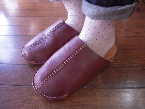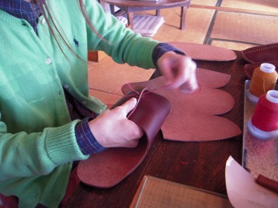 先日6日に蓮田の手づくりやさんで開催した、手縫いで仕上げるレザールームシューズ作りを教室の生徒さんもやってみたいということで、挑戦です! 教室の生徒さんには裁断からやっていただきました。 裁断、穴開け、手縫いが体験出来ます。 さらに生徒Hさんは外にも履いていけるようにとゴム底も貼りました! 構造上長距離歩くには向きませんが、オフィス履きとしていいかもしれませんね! こちらのルームシューズは定期的にワークショップも行おうと思っておりますので、どうぞお楽しみに! そしてこの間写真を撮っておいた作業風景。生徒Mさんが釣り込み中です! もう少しで完成ですね♪