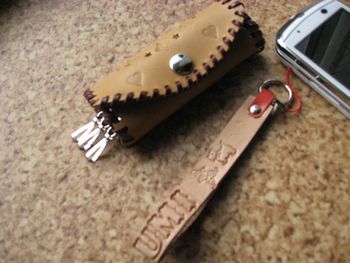 昨夜、地元の公民館で皮小物製作の講習会があり参加してきました。ストラップとキーケースの2点を作りましたいろんな図柄の金属の版があり、木槌をたたいて、皮に図案を打ち込んでいきます。キーケースを広げた状態です。何かセンスがないのが、よくわかりますよね意味もなく図案を並べただけの、つまんない作品に。。。こちらは、キーケースに中の部分ただ、イニシャルを刻印しただけ。。。あ~自己嫌悪。。。どんぐりとか葉っぱとか、出口先生の作品に登場する図案があり、そちらを使ったのですがもっと何とか上手に組み合わせて、素敵なデザインにすればいいのですが。。。次回の機会にリベンジせねば。。。