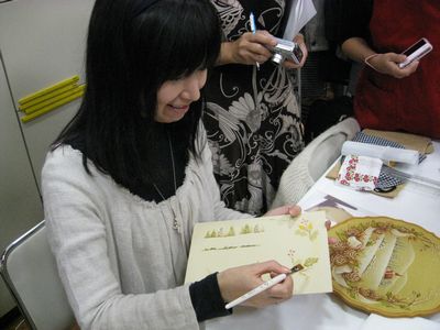 行ってきました~憧れの東京のアンジュさんへ~飛行機が30分も遅れてしまい、どうなるか心配しましたが迷うことなく東中野のアンジュさんまで到着することができました。(20分遅れましたが)出口むつみ先生のマンスリー教室は、ず~~~っと行きたくてでも「東京なんて絶対無理!!」って諦めていたのですが昨年末に三越のイベントに行って、勢いがついてしまい連休ということで、家族で東京に出かけることもあり憧れの教室に参加することができましたちょっと緊張して教室に入ったのですがそこは、出口菌が蔓延状態で同じ菌に侵されている私は、す~っと入っていくことができました~出口先生は、相変わらずお美しく、元気いっぱいでした今回は、ベリーの作品神戸セミナーで、「ベリーのハートプレート」を描いてからあまりベリーは描いていなくて難しいから、ついつい避けていたのですが。。。今回のセミナーでは、もう一回先生の筆使いを見ることができ勉強になりましたこちらは、マンスリー教室のスタンプカードポイントが貯まるといろんな得点がつくらしい。。。先生のデモボードもポイントでもらえる?(ここんとこちょっと聞き逃してしまいました)私も、カードをもらい1個スタンプを押してもらいました。が。。。次はいつ行けるやら。。。でもカードを持つことができただけ、幸せな気分に~今回のセミナーでは、ブログを始めた時から仲よくしてくださっていて出口むつみ先生の通信講座も津田先生の通信講座でも同期のゆりさんと初めてお会いすることができましたゆりさんは、私が想像していたとおり、線が細くてやわらかい物腰でやさしいとても素敵な方でした。淡路と新潟と、すっごい離れているので、お会いすることなんか絶対ないって思ってたのにこうやってお会いすることができるなんてこれも出口先生のパワーなんだろうかなって思ってますその他にもネットで時々おじゃましてる方も何人かいらっしゃってて「ブログ見てますよ~」って声もかけてくださる方もいて嬉しいやら、恥ずかしいやらやっぱりトールペイントをやっててよかった~って思えました私がセミナーに行ってる間、おとうさんと息子は赤坂サカスに行って、それから横浜の日産スタジアムでサッカー観戦!中村俊輔が日本に戻ってきての初ゴールを間近でみることができすっごい喜んでいました。二日目は、湯島天神でお参りして、息子の希望で秋葉原へそれから「サッカーミュージアム」へ行って東京ドームで野球観戦その後、汐留の日テレへ行って、8時すぎの飛行機で帰ってきました(写真は、息子の反対があるので省略します)そして最後に関西の出口ファンの方に朗報5月に大阪サンセイでセミナーがあるのはもうご存知かと思いますが6月のJDPAコンベンションにも来られるそうです(セミナーあるそうです~~~)それに10月にも大阪でイベントがあり、そちらにも先生が来られるそうです!!詳しいことが決まれば、HPに掲載されるということで。。。うふふ。。。すっごい楽しみ