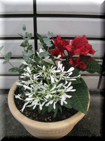 先月から神戸コープで取っているガーデニングコース11月のお花が届いたので、早速植え込みましたユーカリポインセチアユーホルビアユーホルビア「白雪姫」って初めて見たのですが白くてかわいい葉が素敵です~ポインセチアの赤をひきたててくれますこのガーデニングコース、先月から始まったのですが先月分の花、私が植え込んだのを母が勝手にまた植えなおしされてしまってこんな超和風の鉢に植えられてしまいましたまた植え替えたら枯れると困るので、このままにしておくことに。。。