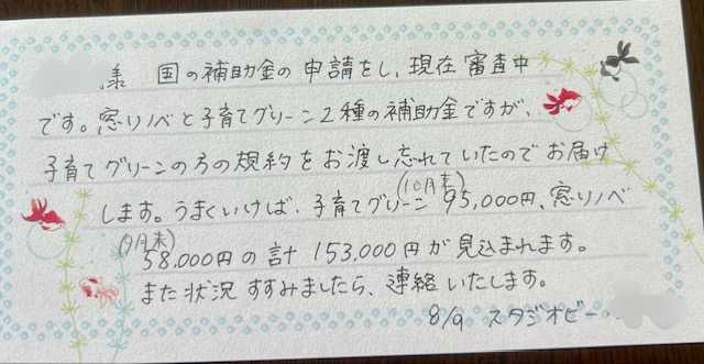 昨日、リフォームしたスタジオビーに夫が行って、補助金をもらってき…