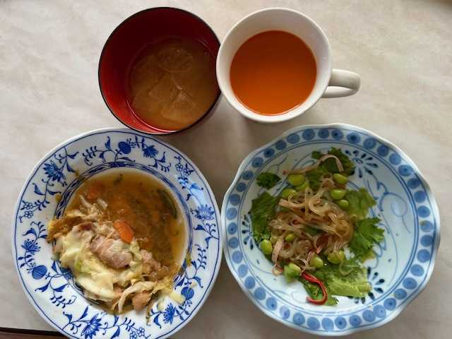 昼食は、野菜あんかけ・かた焼きそば・酢、卵焼き、小松菜のナムル。…