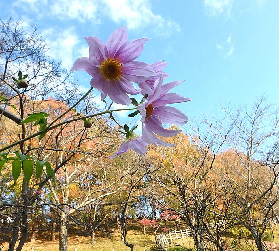 皇帝ダリア、マルバノキ、ノジギク、紅葉見頃に(半田山植物園)
