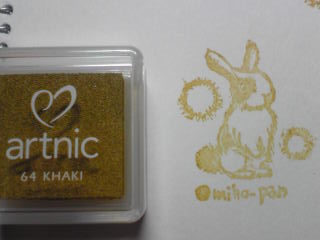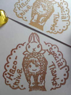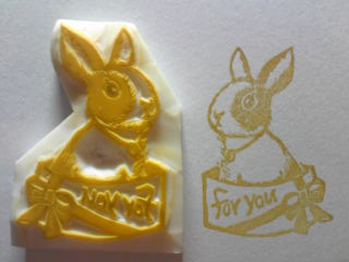 今日は一気に更新!!!(?)今夜作ったはんこです。★自分はどのくらいで、⇒絵を描いてから・・・⇒転写して、⇒消しゴム切って、⇒色を決めて、⇒彫って、⇒スケッチブックに捺すまで。時間がかかるのか?・・・出ました!こんな深夜に~(笑)1時間でした。(((*・д・)ノ+しかし、『for you』の綴りを間違えてないか、とってもドキドキしました。1度、うっかり『fo you』と綴って描いていたので、あれ?って気がついてから、急いでチョコチョコっと、直したんです。(T_T)私、ダメっすなー。たまに、うっかり間違えをしてしまう事多々。取り返しのつかない事になるトコでした。危なかったです。。。今回は、彫るナビ黄色と、カーキインクを使用。私は、ブロンズもですが、カーキインクも大好きです。キラビヤカな色であったりする様な・・・ 古典的な雰囲気があるので!本来地味な色ですが・・・ウサギの色には、全く自然色だろうし、OKだしょ。って、使って~みました!♪☆