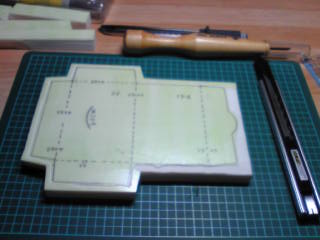 今日は、初めてはんけしくんで、こまけいこさんの図案を、チョコっと彫って練習してみました。妹が買ってきてくれた物で、また今週も開催された、消しゴムはんこ彫り彫り作りの会の、時に渡され~「おおぉぉぉ~!!!」っとなりました。。。ですが、やっぱり、微妙に薄いクセして、ずっしりと重いはんけしくんは、彫り心地までもが、違う違う!!全然、腕に、力を入れないと彫れなかったです。びっくりしました。こんなに違う質感なのだと。はんけしくんは、粘着っぽさがある感じ。刃先が刺さるとキレイに切れるけれど、細かいものは彫りにくかったりしました。(私自信の感想ですが。) ↓なので彫刻刀を変えました!ハンズで購入した『POWER GRIP』とゆう、確か1.5ミリの三角刀で、切り込みました。・・・じゃないと、もげそうなくらい彫じくるのが、難しかった・・・。 ↓そんな感じで、このはんけしくんは、カッチリ・ボッタリ・していると(勝手に)判断し、なんとなく型抜きはんこ用にしようと、決めました!!!そうしたら、楽しくなって途中までやってみたけど、丸々1枚はんけしくんを使ってしまいました。それくらいのものを今回、彫ってみました。(絵ではないです。)しかも、私は、ちゃっかり彫るナビに慣れてしまっていたので、インクを乗せての初転写をしました。乾かない内に・・・なのと、うっかりパールライムを使用したので、パールが手に付く付く・・・。(食事前だったので、ちょっと、考え無しでした。以後気をつける様にしよ。)でも、ライムは良い色で、緑は改めて目に良いなぁ~と思いました。 『ミドリ印面』かなり良いです!!!そんなこんなで、今日まだ途中経過ですが、ポチ袋っポイ、型抜きはんこ!→ → →切り込み入り。。。 (自信無し。) ・・・です。 仕上がりは、またのご報告で・・・ すみません。ちゃんと完成したら、またアップさせてもらいます~~~。++++++++++++++++++++++++++++++++++++++++++++++++++++++++++++++++ちなみに、今日は近所にあったキルトショップに、妹連れて、初めて入ってみました。講習会などもあるそうで、たまたま入った時は外国の方とお喋りしているお店の方。キルトに多少の興味は、あり(飾る程の場所は部屋にありませんが・・・)、ちょっとした、がま口サイフの金属部分や羊毛や、チロリアンテープなどなどあり、興味そそられました。駅から間逆の場所に、客人はいるのかちょっとお店が無くなってしまわないか心配になりましたが、また行ってみたいと思いました。++++++++++++++++++++++++++++++++++++++++++++++++++++++++++++++++・・・すみません。結局、今日中に完成してしまいました。線がガタガタだったので、恥ずかしいですが、、、とりあえず、載せちゃいますっ~!■完成形がこの形。家にあった、黄色の紙に、赤と紫のインクを捺してみました。ちょっと山折りの線がガタガタだったり、切れ込み線が剥き出しだったり、してます。愛嬌でカバーできない・・・かな? エヘ(・ω・*)♪長いもの読んで下さってありがとうゴザイマス。私は、一気にやってしまいたくて仕方ない、集中型タイプみたいです。