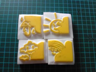 今日、朝一番に彫ったはんこです~!■太陽・雨・曇・虹が、山陰から覘いているところです。それぞれ色違いのインクをつけてみました♪ちょっと、虹の目をどうしようか悩みすぎて、ポロリと、なってしまったかも?でも、色を残し、少し加減。全部、大きさが違うので、揃えなきゃ!(↑切り分けが下手~。)天気の絵を前に描いた時、こんなキャラもいいな~☆と思いました。顔をつけたら、なんか一気に明るくなる(o・v・o)コップや、カバンも顔をつけたら可愛くなったりして。まーほどほどにかな?