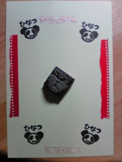 今回は、写真図案をお借りしました。ちょーど良いサイズの黒ナビ!があったので、ちょっと三角刀の実験に使いたくて・・・でも、すっかりはんこは、変貌をとげてしまい、思ってたものとだいぶ違うはんこになってしまいましたとさ。(;__;)こんなもんだったか、私の出力・・・。今回は、以前買った細い三角刀を何とかできないか?放っておいたら、錆びてしまう可能性も。と、1度使って、『なんじゃ、これ、使ってる人いるのか?』となったものに再チャレンジです。最終的には、慣れたもので出来るとこまで、複製?しましたが、はんこ面、ボロボロです。ごめんねーパンダよ。相方に、出来たの見せたら~「パンダの中に誰か、入ってるゾ!」なんて腹の立つ、(心の中では、『確かに入ってるカモ・・・』)ご意見を頂きました。まーいいや。もっと練習、練習!あーーーーとにかく彫刻刀を駆使出来るようになりたいよー!