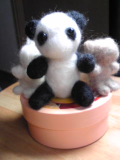 まだ途中ですが、載せてしまいます。パンダ・・・はまだ鼻がないけれど、イメージ通りに作ったわりに、 今一番マシな方。一番チビの姪にあげようかな? (パンダ好きだったと思う。)ウサギ・・・は可愛い姪が好きと知って、可愛く作ろうと奮闘中のもの。 昨日はまた、手に突き刺してしまった。 これが結構、指先痛い(。_。;) 赤の目にするか考え中。 ピンクではんなり、可愛くしてやろう~♪ リス・・・ リスって、シマシマが茶色で、ベースが白だった事に 全体作った今、後から気が付きました。 絵だと、茶色って認識してたし、動物園でもなんとなく。 だけど、この茶色に勝る、濃い茶色の羊毛フェルトがないので、 白を後から、付け足す感じになるのかな。 (シマシマを残す→逆ってヘンな感じ。) 今回、手作りっていいな。って思いました。友達の、ユメコちゃんも、手作りでお弁当箱入れ作っていた。手縫いって言ってたけど、やっぱりミシンが欲しいよね。って。ボビン付けが難しいけど、色んな雑貨を作ってみたくなってしまいそう