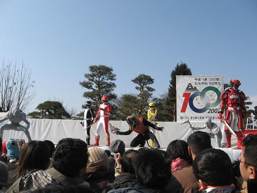 昨日、氷彫まつりで「ボウケンジャーショー」がありました。前の方みんな、地面がドロだらけにもかかわらず、しゃがんで見ていました。この写真を撮ったのも子供二人としゃがんで見ていた主人です。私は?というと後ろーの方で立ってみてました。感想は、声優さんは別人なのか、棒読み。(せめてテープでやるとかさ~)コスチュームを着ている俳優さんは短足。(かっこよくない~)イエローはめちゃめちゃお色気キャラ。(そんなにくねくねしないで~)うーん、こんなショーでもいいのか?(よくないよ~)あまりに情けなくて見ていてつまらなかったので、主人と子供たちを置いて近くの喫茶店でお休みしてました。もちろん、いる場所もメールしておきましたよ。だけど、ショーが始まって、40分位しても電話こないし、どうしたんだー?と思って帰るとようやく終わったところでした。子供達も情けないボウケンジャーに嫌気がさして、カレンダー欲しいとか言っていたらしいのに「買わない。」「つまらなかった。」主人に至っては「足が痛い。」身動きとれず、まるで拷問だったとか。「ママだけずるい~。」と言われましたが、ママはみんなのところまで近寄れなかったし(私だけみんながショーを待っている間にスタンプラリーを家族分したてら近寄れなくなっちゃったんだもん)久しぶりに見たショーはとーっても不評でした。