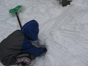 今日も雪がたーくさん降ったので、庭の雪を集めて山にしました。しかし、さらさらな雪のため固まらず小さな山にしかならなかったのですが、一生懸命かまくらを作るんだと穴を掘っておりました。