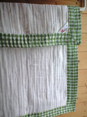 先日ぽちったふんわりガーゼ fu wa raさんの雲のガーゼポルカドットでベビーカー用のブランケットを作りました150CM幅を2M購入したのでどーんと一枚のブランケットにしようかとも思ったのですがいいお値段の生地で失敗したらとそんな勇気がなかったのであまりに手触りが気持ちいいのでこれはやっぱ三太郎向きかなと先ずはブランケットとなりました。 サイズは大体50×70CMです。縁取りはRRさんのギンガムチェックのリネンだと思います。(寝かし期間長過ぎてうろ覚えだけど)タグはこれまた寝かし過ぎていつのだか覚えていないRRさんのおまけタグ。ベビーカーで膝にかけて上を折り返した時に見えるよう上部裏側に付いてます、決して間違えたわけではありません 雲のガーゼ、ミシン縫いはしやすいです。でも裁断がちょっと大変厚くてやロータリーカッターで下まで切れないとか重なったガーゼ同士がずれるいう意味ではなく、水通し後でふわふわでこぼこ厚みがあるので定規からずれるというか直線が上手くとれないんです何かコツってあるのでしょうか?誰か教えてください 今回使ったのはこちら♪私のは水通ししたのでうねうねになっていますがふんわりとろとろの手触りは変わりありません こちらは新製品の四重織ネオ雲のガーゼ29日の9時59分までお得なキャンペーン開催中ポイント10倍四重織ネオ雲のガーゼ2M以上お買上でもれなくポイントカード500P分プレゼント一万円以上お買上(ネオ雲以外でもOK)でもれなくポイントカード500Pプレゼント購入後にレヴュー記入すれば先着で500Pつまり、ネオ雲3色を2mずつ購入すれば最大で2500Pです♪これからの季節なら四重ガーゼもいいかもしれませんね