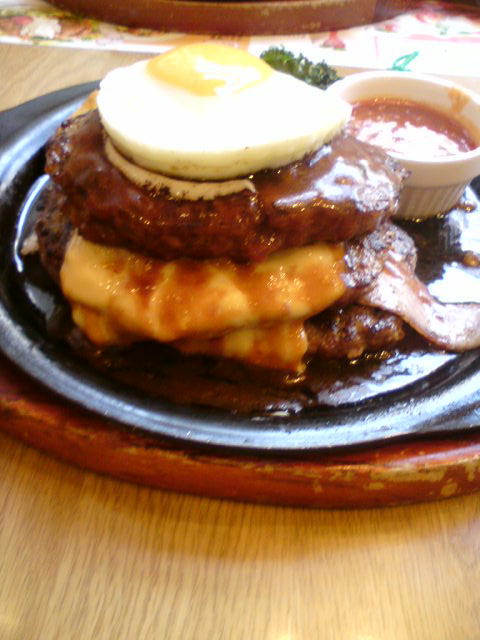 今日は本来なら脚トレの日ですが、家族の付き合いでオフです。まあ仕方ないですね。そいでもって新宿の伊勢丹メンズ館(本館の隣にあるメンズ専門のビル)に行ったんですが、スポーツ用品売り場にイタリアブランドのトレーニング用品を売る店があったのですが、さすがメンズ館。ここは結構なお値段をお支払いしないといけないセレブな店ばかり入っているのですが、トレーニングも同様らしく・・・・結構色んな事が出来るマルチマシンが置いてあって少しだけ触ったのですが、店員さんに値段を聞くと、なんと100万8千円!!それだけあれば滅茶苦茶豪華なホームジムが出来るぞ!!誰が買うんじゃいと思ったら、外資系ホテルなんかに入っているらしく、ジョルジオ・アルマーニなんかが顧客らしい。もう笑うしかないですよね。昼は別の所でガストに行きました。で。食したのがコレ↓トリプルハンバーグとか言うヤツです。下からハンバーグ・ベーコン・ハンバーグ・チーズ・ハンバーグ・たまごなんとも贅沢な一品、これだけで1500kcal以上!メガマックやクウォーターパウンダーなんて目じゃないって感じ。でも味が単調にならないようにサルサソースもついていて美味しかったですよ♪ご飯大盛りを食べてもハンバーグが残るって、凄い贅沢~。ハンバーグだから脂質もたっぷりですが、いいんです!オフだし、テストステロンの原料ですから~!!でも明日はしっかりトレしないとね!!ではでは~(@^0^)/~