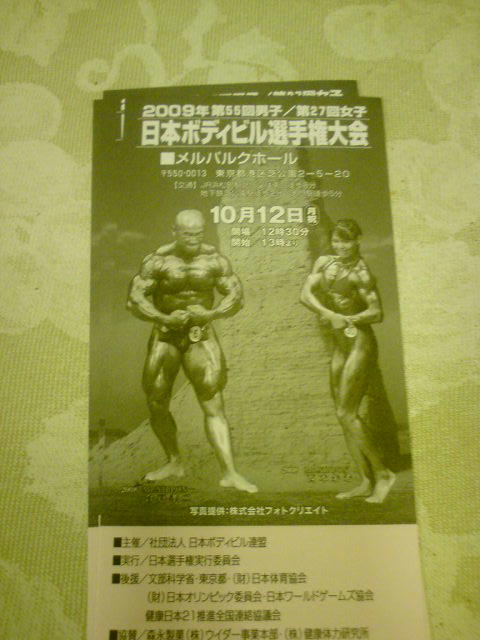 今日は午前中に選挙に行って、昼飯食ってからゆっくり出かけました。行ったのは・・・そう、東京クラス別ボディビル選手権大会!!去年までならジムで予約して特等席で見ていたんですが、今年は当日券。当日の昼からでもそれほど悪くない席で見れてしまうのが、嬉しいやら悲しいやらww当ジムからは3名の出場!結果は2人入賞でその内一人は4位だったので、ポーズダウンは割と興奮できました♪その他にも何人か知り合いが出ていたので各階級とも興味津々。60級なんかあの登坂さんが30~40代の若手を抑えて準優勝!!74歳!あんな風に年を取れたら最高だろうな~!!65kg級も北千住GGの人が上位に入って結構びっくり。個人的に注目は70kg級!!北千住のトレーナー君といつも予選落ちでケーンさんも気にされていた某巨大掲示板での有名人と去年75kg級で準優勝した方。トレーナー君は例年はしぼんで見えていたのが今年は明らかにハリが良くてバランスもグー!で個人的には3位以内もいけるかも!?という感想。階級落とした方はさすがにかなりバルクダウンしたように見えて絞れているけど去年のインパクトが強くてちょいとアピール不足に見えてしまった。某有名人さんは肩と背中の厚みはバツグンですが、背中の広がりが少し弱く、腹は内臓肥大に見受けられる。結果、なんとなんと毎年調整ベタで予選落ちだった某有名人さんが優勝!!やはり強い部分の審査員受けが良かったようだ。階級落とした方は3位、トレーナー君は4位でした。今夜から明日の某ブログと掲示板は凄い事になるだろうな~。75kg級は冒頭で紹介した当ジムの選手が登場。元埼玉チャンプ、惜しかった~!!75kg超級はゴリさんがメールでうるさく(笑)聞いてくる後輩君がクラス別3階級制覇を達成!!すんげいです!!自分の注目選手以外にも一緒に行った某大食い大魔神さんの知り合いを応援したりしたので各クラスとも飽きずに楽しめました♪♪とにかく大会観戦は去年のMr.東京以来だったし、大魔神も一緒だったのでメチャクチャ楽しかったです!!一度見るとまた見たくなるのが世の常。さあ次はどこへ行こうかな!?っと、その前に明日かたまた出張~せっかくモチが上がったのにトレできないなんて、なかなかうまく行かないもんですねではでは~(@^0^)/~