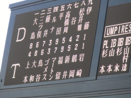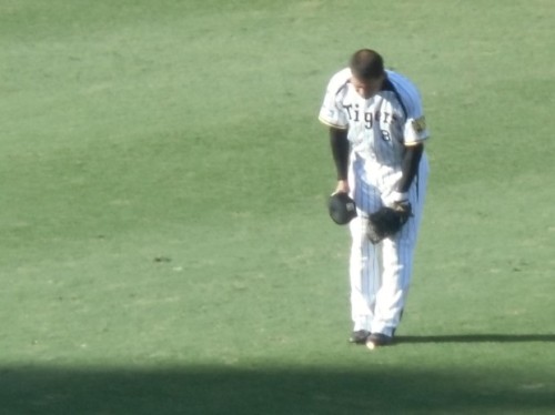9月になってふがいない試合が続く3位タイガース。今日は中4日で登板のメッセンジャーが好投、しかしタイガースも点が取れず、0-0で迎えた7回裏。なんと 福留選手がライトスタンドへソロホームラン<福留コール>そして、2死2塁からケガから復帰した西岡選手が代打で登場し、タイムリー3塁打<打った瞬間! ちょと画像がズレてます^^;>次の上本選手もタイムリーを放ち3-0!8回裏にマートンの2ランホームランが出て5-0!9回は呉昇桓が抑え、久しぶりに気持ち良い勝利ヒーローインタビューはメッセンジャー・福留選手・西岡選手でした。この勝利で2位広島とは2.5ゲーム差。4位のDeNAとは4.5ゲーム差。首位巨人とは7.5ゲーム差。残り14試合を全部勝って巨人が全部負けてくれたら優勝なんやけどなぁ~
