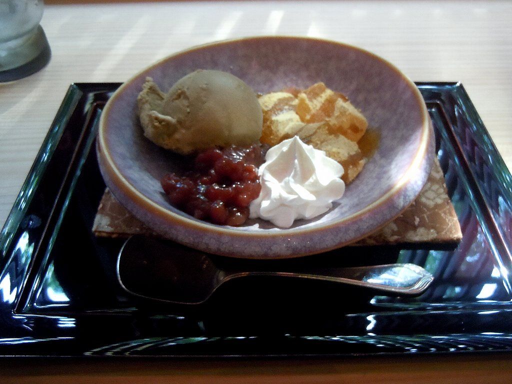 そんなこんなで再び兼六園へ向かう坂道を上り金沢城公園の石川門に向かいました門をくぐって城内に入ってビックリ外からは伺い知れない広い敷地が目の前にありやはり最後の行程にして良かったと思いました (^-^;よく分からないままに建物に向かい入城できるところには入ってみました過去の資料に基づいて再建されてキレイすぎ それにしても昔の人の創意工夫や技術は凄いですね身近に存在する自然界の素材を如何に活かすか城の構造も単純そうにみえて複雑だし機能的あの五十間長屋にどれだけの食料や武器を備蓄したのか城壁を登る敵兵に石を落とす出窓や銃砲狭間が必須ならば西洋の城が高い塔ばかりというのも解りますせっかくの広場だというのに暑いせいなのか遠足の学生たちは遊びもせずベンチでたむろっていましたそんな暑さの中でも広い園内のあちこちで草取りをしているオバサンたちがたくさんいましたああいう人たちが庭園を守っているんですね昼食が軽かったのと暑さで喉も渇いたので兼六園の坂付近にある和風喫茶に入ると店のスタッフがみんな着物姿で素敵でしたさすがの観光地だけあってレンタル着物姿のアベックを何組か見かけました春や秋なら良さそうですが暑い時は大変そうですせっかく着物を着たのならせかせか歩かずにもっと優雅にゆっくり歩きたいところですね久々にたくさん歩きました外出時に持ち歩いていたケータイの万歩計は帰宅した時 13065歩 となっていましたしかし脚の疲れは大したことがなく顏の火照りの方が気になりました翌日も脚は痛くならず丁度よい運動だったようです« おまけ »ほうじ茶アイス を食べてみたくて注文しました 左上がアイスで隣にある わらび餅 が温かくてビックリほうじ茶アイスはサッパリした優しい味で美味しかったです