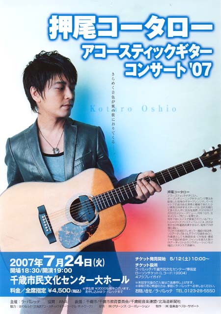 押尾コータロー アコースティックギターコンサート07千歳市民文化センター大ホールにて行われます。時間や詳細は下記のポスターを参照してください。地元でのイベントなので告知しました~~~^_^/