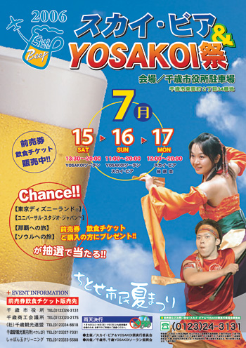 千歳市役所の駐車場で、今年も行われるお祭り「スカイ・ビア&YOSAKOI祭」。ビールを飲んで、YOSAKOIを見て、美味しいもの食べてと、言うこと無しのお祭りです。毎年僕も参加させてもらってます!!ありがとうございます。是非!皆さん足を運んで、美味しいビール、YOSAKOIに酔いしれてください。生ラムの応募が少ないので、皆さんどしどし応募下さい。当たる確率高いですよ。