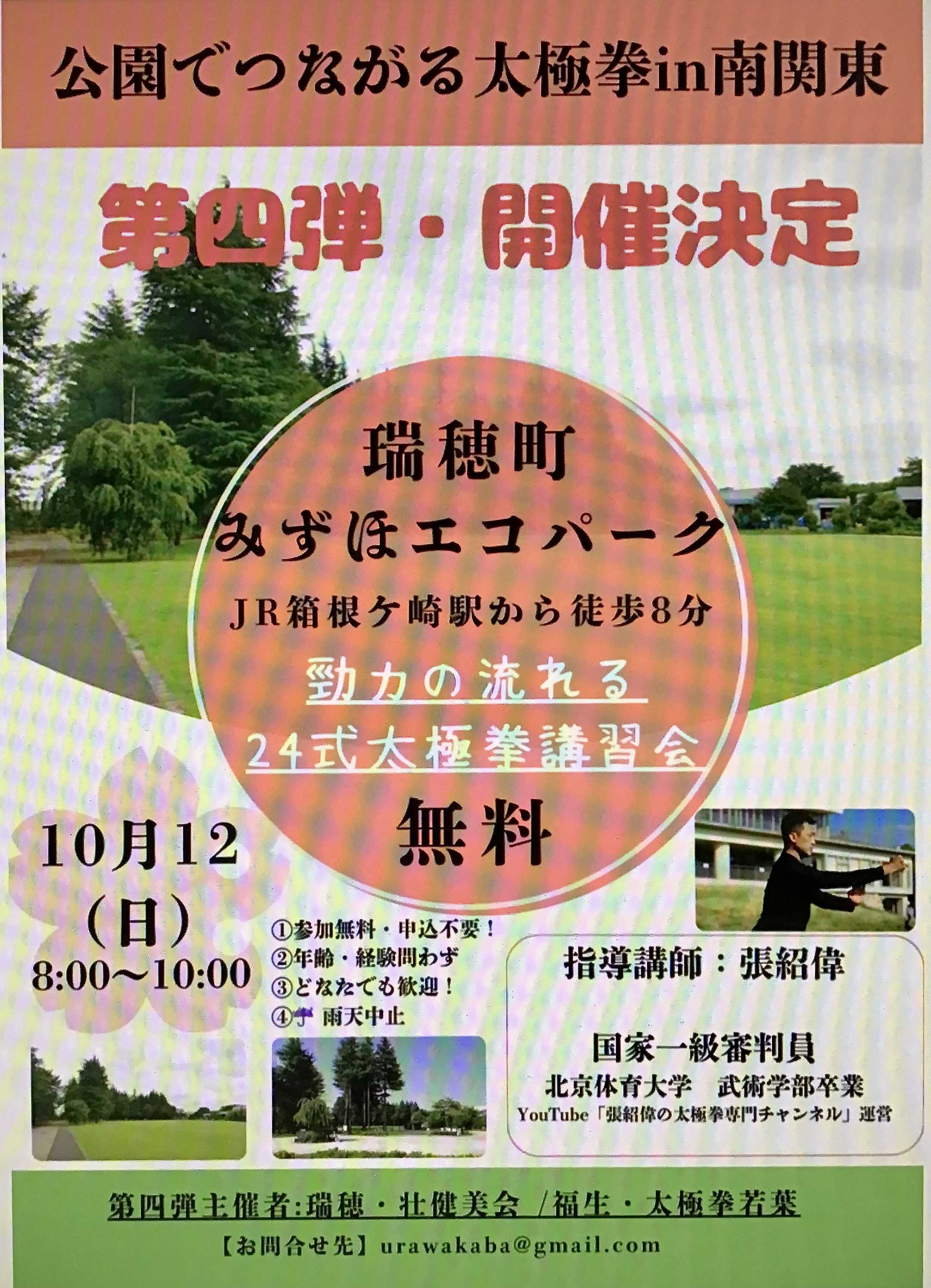 あと2日 10月12日(日) ✳️太極拳 無料体験会 ★申込不要、朝の散歩がてらにお気軽にご参加下さい。⚫︎場所 西多摩瑞穂町「エコパーク」(新青梅街道,16号線アンダーパス信号の角)⚫︎時間 朝 8時〜10時⚫︎講師 太極拳界のスーパースター 張紹偉(チョウ,ショウイ)先生 https://www.youtube.com/@taijipower