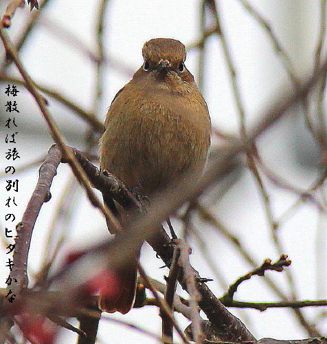 晩生の枝垂れ梅が咲き始めたので、カメラを向けているとヒタキが割り込んできた。梅は、昆虫や小鳥などが開花を促すからその気になって咲き始めるのだろうか。その寄ってくる昆虫がヒタキの結構なご馳走と梅の木を好むのであろう。仮に、天敵の百舌などに襲われたとしても、梅の小枝で身をくねらせて逃れられるから枝の混んだ梅は格好の遊び場である。*それにしても、真正面から見るヒタキは、なんと凛々しいことか。今までは、側面から観ていて「可愛いなぁ」とだけしか感じなかった。目は窪んだ位置にあり、頭を動かさなくても、300度の角度の視野があり、鳩や雀のようにキョロキョロせずに必要以上のエネルギーを使わなくても済む。その上、頭が大きく突出しており、その中にいろいろな知恵が詰まっているのであろう。特に、子作りのために何千キロもの旅をするが、その時期、方角、グループのことなど、ぎっしりと詰まっている。その中には、人間学に対しても、他の野鳥と異なったアングルが記されているのではないかなぁ。そうでなければ、3メート程度しか離れていないのに俺の前に正面から立ちはだかるはずがない。