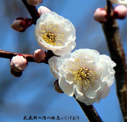 昨日の賞梅、「藤牡丹しだれ」。藤の枝垂れのような樹形、大人の背の高さ程でなにやら悲しさを秘めている。花の下に蕾が二つ並んでいて香を入れる袋のようなイメージに撮れた。でも、満開になれば一つ一つの花の個性が見えなくなり、ただの枝垂れ梅の姿になる。*斉昭公は、梅干しを作る目的であったから梅花ひとつひとつに関心がなかったのかも知れない。でも、当時、既に300種を越える品種があったから、園内にそれを網羅する意気込みであったのであろう。それにしても、花の大小、咲き具合、色などに何年も何年も飽かずに見つめ続けていて人がいた。そして、このような多彩な梅が誕生した。これは人間しかできない技。だから人間を抹殺する原発遊びなど止せと梅の精は申していた。