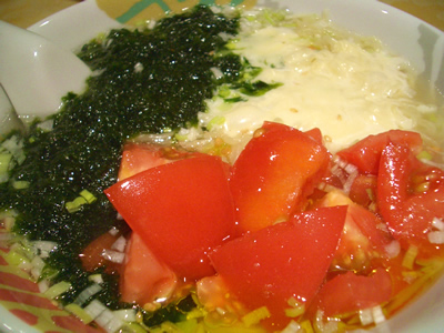 一人のお昼なんかは、手抜きで、インスタントラーメン なんていうこともあります。もう、20年くらい前から、インスタントラーメンを茹でる時には、ヘタをくりぬいたトマトを一緒に入れて、途中で崩しながら食べるのが定番です。トマトって、とってもダシが出るので、スープも美味しくなるんですよ。最近は、たまに、写真のようにトマトを刻んで軽く塩して美味しいオリーブオイルと和えておいたものを出来上がりにトッピングしたりもします。塩ラーメンなんかだと、美味しいオリーブオイルと良く合うんです。出来上がりにスライスチーズをトッピングするのも定番。スライスチーズは、アツアツご飯にのせても美味しいけれど、ラーメンにもグー。そういえば、ラーメン屋さんでも、モッツァレラをのせたりするところがありますけどね。結構、フツウのスライスチーズで十分です。ワカメのようなのは、「あおさ」。最近のマイブーム。熊本の名産品のようです。スープに投入するだけで、生のりのように戻り、ものすご~く良い風味。チーズやオリーブオイルとも相性バツグンです。全国から注目されているサイトが大集合!日記・ブログ人気急上昇ランキング