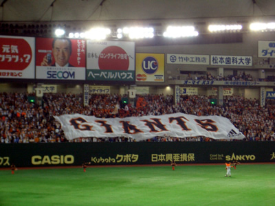 ジャイアンツの応援に、東京ドームに行ってきました。チケットは、先行の抽選に全部はずれ、発売日にネットでクリックしまくり。3塁側のA席(エキサイトシートの上あたり)しか取れなかったけれど、行って見ればやっぱりホーム。3塁側も、ジャイアンツファンのが多かったです。たまたま、席の前も横も日ハムファンで、隣の人なんて、ノートに選手の応援歌をメモしたのをカンニングしながら熱唱していました。途中までは、日ハムの何でもない打球とジャイアンツのエラーで入ってしまった1点のまま進行し、かなりイマイチな展開でしたが、ピッチャーが負けない山口に交代してからは流れが変わりました。1点を追う九回、先頭打者の亀井がドーム全体に「かめいよしゆき~!」コールが響く中、同点ホームラン!その後、これ以上ないシンノスケコールの大歓声の中、阿部慎之助がサヨナラホームラン!!途中まで、今日はタオル振れないかと思ってましたけど、いやぁ、気持ちよかった。しかも、3塁側で万歳するのは、余計気持ちいい。笑