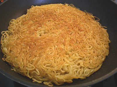 我が家の焼きそばは、こんな風に、両面を良く焼いて、「表面はカリッ、中はふんわり ♪」な食感の麺が定番です。麺をほぐして、少量のお醤油と胡麻油を絡め、熱したフライパンに入れ、軽く炒めたら、平らに成形して、焼き、イイ感じの色になったら、ひっくり返してまた焼きます。何度も作っているうちに、空中でひっくり返すのも、ラクにできるようになりました。例えば、今日はこんな、豚肉と野菜の餡で食べました。チンジャオロースーをかけたり、その時によって色々ですが、ソース焼きそばにする時も、一度麺を両面しっかり焼いておいてから、炒めてソースを加えた野菜と混ぜると、ぶよぶよにならず、美味しいですよ。