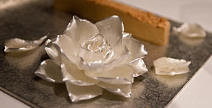 昨日の結婚記念日は、いつものカンテサンスでお食事しました。お祝いの時には、デザートの時に、手作りの飴細工のお花を作って下さるのですが、昨日は、お花が食べきれそうになかったので、お持ち帰りさせて頂きました。お店で見たときには輝くシルバーのバラだったのですが、今朝見てみたら、白バラに変身していました・・・・↑以前、たしかお誕生日に作って下さったバラ。最近は、メインダイニングでお写真を撮る事はできません。↓一夜明けて、きれいな白バラに変身!食べても美味しい飴細工なのが凄いところ。今回も、お料理もワインもサービスも大満足でした。そうそう、忘れられちゃいけないのが、ピエモンテ州アルバ産の白トリュフ!!ハモのブランダードにオプションで、白トリュフを山盛りトッピングしてもらいました!めちゃくちゃいい香りでした~スライスした白トリュフの模様って、洋服にしたくなるようなキレイな柄です。