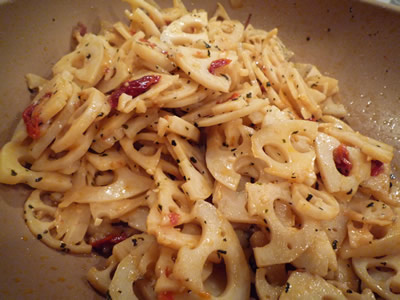 よく登場するレンコン炒め。イタリアンなキンピラといった感じ。オリーブオイルでニンニクを炒め、唐辛子とレンコンを加えて炒めたら、水につけて戻しておいたドライトマトを汁ごと加えて、水分を飛ばします。アンチョヴィを入れてもいいけれど、私は秋田の「しょっつる」かイタリア版しょっつるの「コラトゥーラ」を隠し味に入れ、仕上げにスイートバジルを。日持ちするし、ワインにもぴったりなので、人気の一品です♪レンコン大好きなのですが、おせちによく入れる、煮たレンコンにはそれほど魅力を感じないので、我が家ではレンコンはお正月もこんな感じです。ちなみに、同じ理由でごぼうもキンピラにしちゃいます。「コラトゥーラ」というのは、イタリアの魚醤で、アンチョビを作った後、漬物のように押し蓋におもりを乗せて魚を熟成させ、表面に上がってきた液体を取り出して保存、さらに夏の太陽に当てることで魚の熟成が進み、半年くらい経ったら保存しておいた液体を戻し、魚の間を通してろ過させる・・・・これを何回も繰り返して作るのだそうです。しょっつるもそうですが、食べたことがない方が思うよりも匂いもなく、透明感がある味で、和食にもイタリアンにも使いやすい調味料なのです。濁っているタイプのものを買うと、臭い事があるので、透明なタイプをおすすめします!