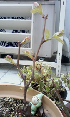 前シーズン、葉が落ちた後に、思い切って剪定したブドウ。 その後、あまりにも音沙汰がなかったので、「生きてるのかしら・・・・」と思っていたけれど、春になったら、ちゃんと 芽吹いて、ピンク色の葉っぱが生まれました。でも、せっかく出た芽だけど、これ、「芽かき」をして、落とさないといけないんですよね。かわいそうだけどね。※調べてみたら、芽かきは まだまだ先でした。