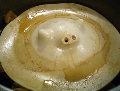 シリコンでできています。鼻の穴に菜ばしを入れて持ち上げられます。ブヒブヒ(とは言いませんが)鼻から蒸気が出て、かわいいんです。そのまま食器洗浄器に入れられるし、木の落しブタよりも匂いがつきにくくて、扱いやすいです。