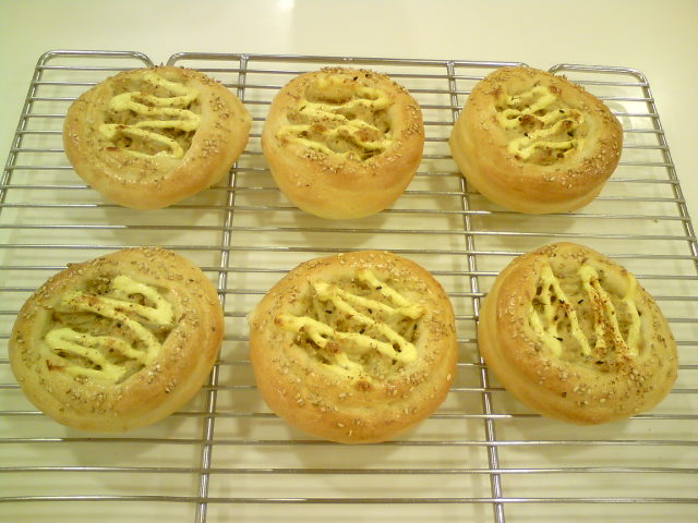 今日も暑いですねもう夏バテしそう 昨日は、久しぶりに午後から仕事に行った旦那と帰りに待ち合わせをして飲みに行ってきました(私はもちろんノンアルコールですが)たまには、外で待ち合わせというのも新鮮で良いですね 『ラーメンサラダ』やら『牛ハラミ串焼き』『お好み焼き風焼き飯』等、色々食べましたこの時期にビールが飲めないのは辛いです そして、今日は『イタリアン・パン・ド・ミ』というパンを焼きました生地にバジルとガーリックパウダーを混ぜ込み、粉チーズとベーコンを巻いて焼いたパンですエアコン入れなかったので、生地がだれて不格好ですが味は美味しかったです明日の朝食にしま~す では、おやすみなさい