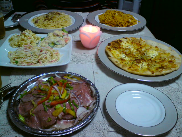 こんばんは今日は、天気も悪くてすごく寒いですね せっかく開花した桜も一時停止ですねー 日曜日 我が家は結婚記念日を入籍日の12/23に決めたのですが3/21に結婚式をしたので「結婚式記念日」ということで簡単にお祝いしました 冷蔵庫にあった『ピザ』を焼き『ローストビーフ』と『サラダ』を買って『パスタ』を作ってイタリアン風の夕飯にしました真ん中にあるキャンドルは、結婚式の時にキャンドルリレーをした時のものです旦那の案で毎年灯すことにしましたそして、一緒にケーキを作りました旦那が小枝で「1」を作ってくれましたナイスアイディアそして、もう滅多に見ることもないので結婚式のDVDを観て過ごしました1年は本当に早いですね~何年経っても、こうやって過ごせれば良いんですけどね 最後にちょこっと昨日の夕飯と今日のランチ『鶏手羽元と大根の煮物』『ブロッコリーのサラダ』『浅漬け』『ほうれん草と卵の味噌汁』会社近くのラーメン屋さんの一日限定20食の『とりそば』すっごく美味しかった では、また元気のある時に~