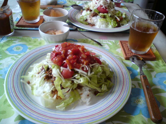 こんばんは今週はちょこちょこ予定がありました 火曜日には私が3・4歳の頃から妹のように遊んでいた子が、もうすぐ1歳になる子供を連れて遊びに来ましたランチには『タコライス』を作ってあげましたよ沖縄に旅行に行くと、何回も食べてしまう『タコライス』美味しく出来ました~近々、夕飯に出そうかな そして、以前からパンを作ってみたいと言うのを聞いていたので赤ちゃんが寝ている間に『アーモンドクランチロール』を作りました卵もバターもたっぷりで美味しい生地なので、とっても感動していました良かった そして、水曜日は前の会社の方々とランチしました皆、子連ればかりで可愛かったですしっかりママさんになっていました尊敬しちゃいますね食べたのは『洋風ロールキャベツ』ボリュームたっぷりで美味しかったですよそして、一足お先に帰らせてもらい両親学級に行ってきました旦那と共にマッサージとか色々学んできました そして、今日は実家で寛いできました美味しいものばかりで食べ過ぎたかなり体重が増えてしまっているので、気をつけないといけないんですけどね 最近の夕飯コーナーでございます『トマト水餃子』『牛肉のペッパーライス』『サラダ』『トマトそうめん』最近、トマトが美味しくてまた色々作りたいと思いますでは、夏バテに注意して頑張りましょう